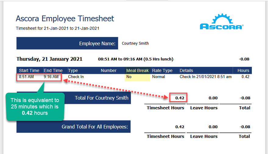 - This report shows check in and check out time which is 25 minutes total or 0.42 hours.