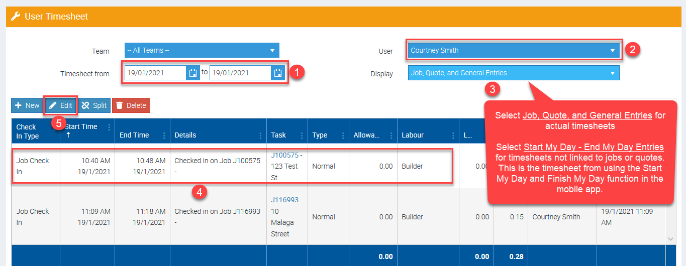 In this example, we retrieved 21 January timesheet details for user Courtney Smith.