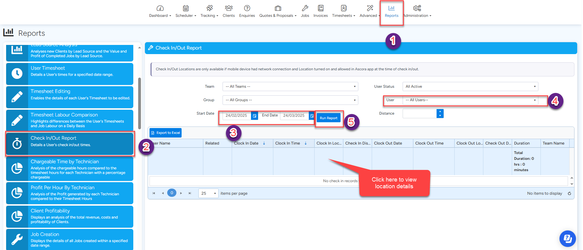 - Clock In/Out Reports track precise check-in locations for better accountability.