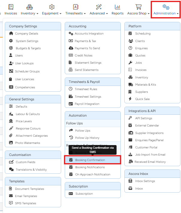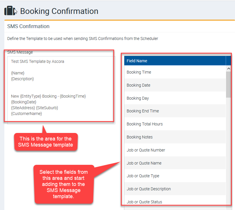 Effective communication with your customers is key to smooth operations. With Ascora, you can customize your SMS template for booking confirmations so that every message is clear, consistent, and automatically populated with important details like booking date, time, and job description. This guide will walk you through building and saving your SMS template, ensuring that you can efficiently notify your customers of their upcoming appointments.