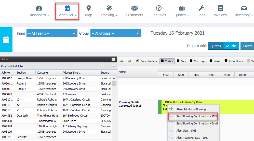 1. Go to Scheduler and right click on a job then select Send Booking Confirmation SMS.