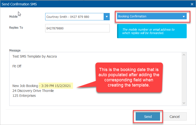 2. Select Booking Confirmation as the SMS Template and click Send.