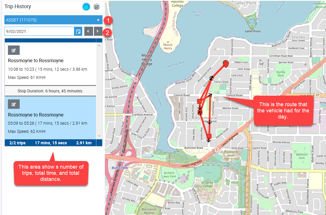 In this example, we selected asset (171070)which had two trips on 9 February and we can see the trip view in the map area represented by the red line.