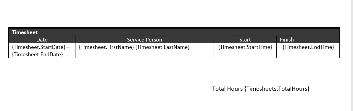 1. Open the Word Document template that you've downloaded and add a table with the required field codes to capture timesheet details.