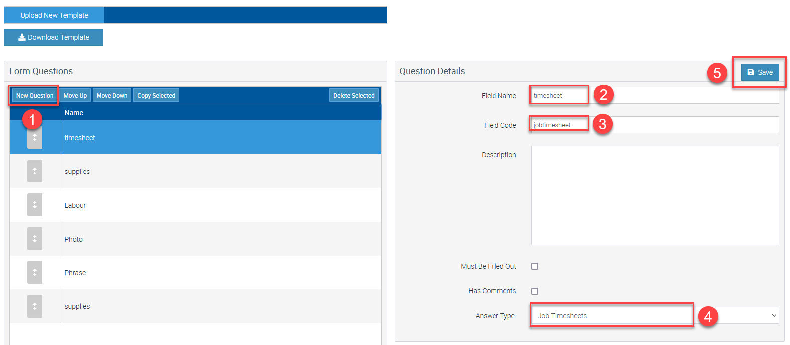 4. Add a custom form question and assign a unique field code and select "Job Timesheets" as the answer type.