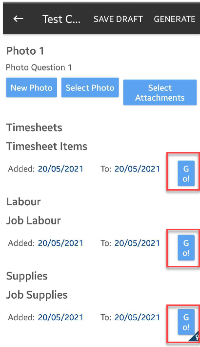 3. Tap Go button in Timesheets if you're adding timesheet details, and the other Go buttons buttons if you're also adding labour and supply details.