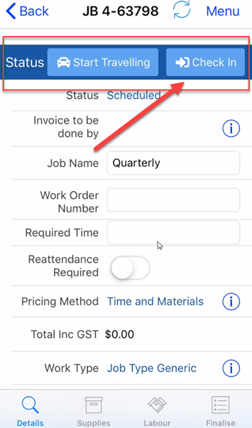 4. You will see the Check In Touch the Check In button to Check In to the Job.
