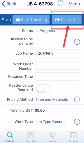 5. When you are ready to Check Out of the Job, press on Check Out. This can be found at the same place where Check In was on the Job Details tab.