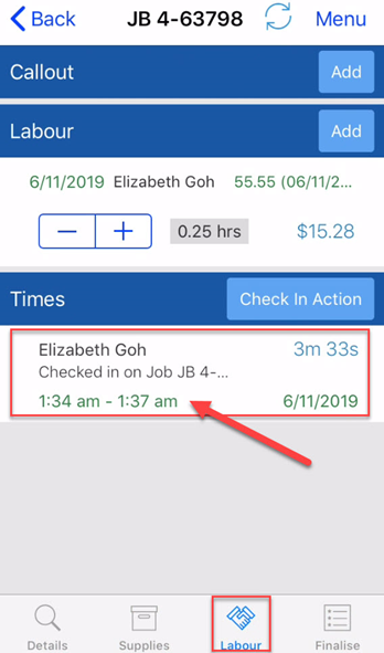 6. To check that your Check In and Check Out function has worked correctly, you can touch the “Labour” tab and you will be able to see the Check In and Check Out times.