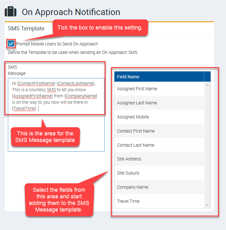 2. Tick the box to enable this setting and you can define the Template to be used when sending an On Approach SMS.