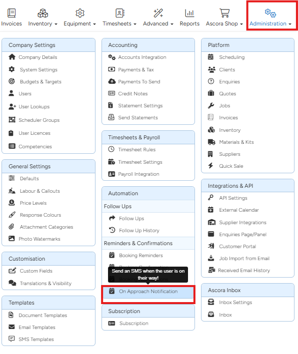 1. To enable such setting and to create your SMS Template, go to Administration → On Approach Notification