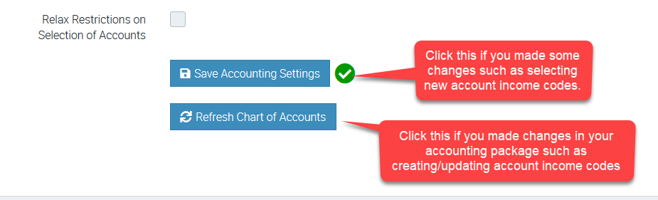 When you make changes in Accounts Integration page such as selecting new account income codes, it is important to click Save Accounting Settings.
