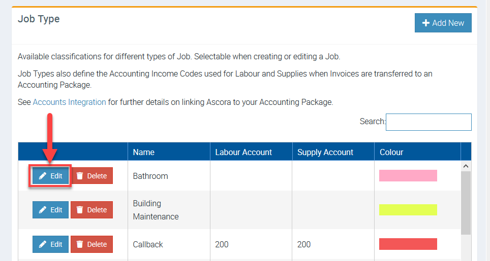 You can set up unique income codes for each job type and you must first set up your job account codes in your Accounting Package. Once done, go to Administration → Accounts Integration and click Refresh Chart of Accounts.