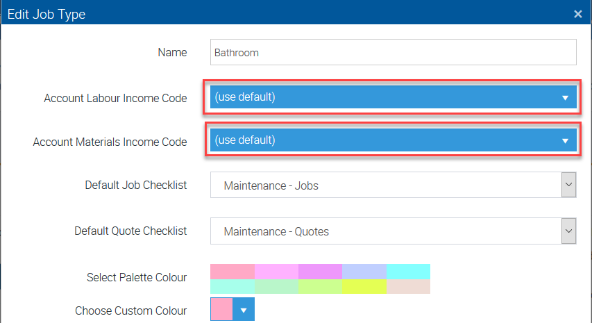 | Default Labour Income Account | This is a sales income code unless you set up a unique income code for each job type. |