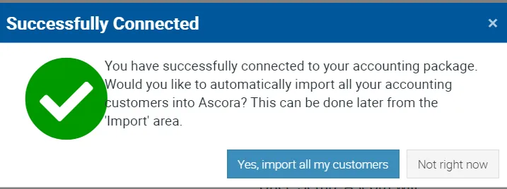 When you connect your accounting package for the first time, it will ask if you want to import your customers from your accounting package into Ascora. You have the option to click Not Right Now so you can import at a later time.