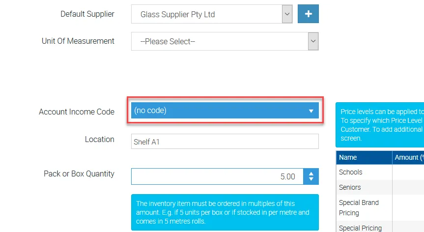 | Default Materials Income Account | This is a sales income code unless you set up a unique income code for each supply or material. |