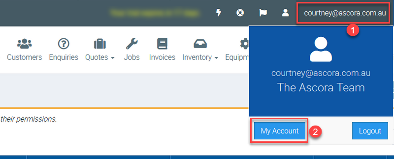 1. Click on your email address located at the top right hand side of the Ascora screen and click My Account.