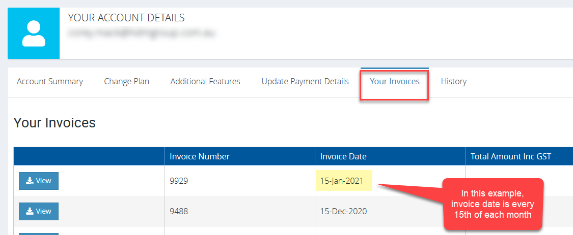 1. You can see your invoice date by clicking your email address on the top right of the screen and click My Account
