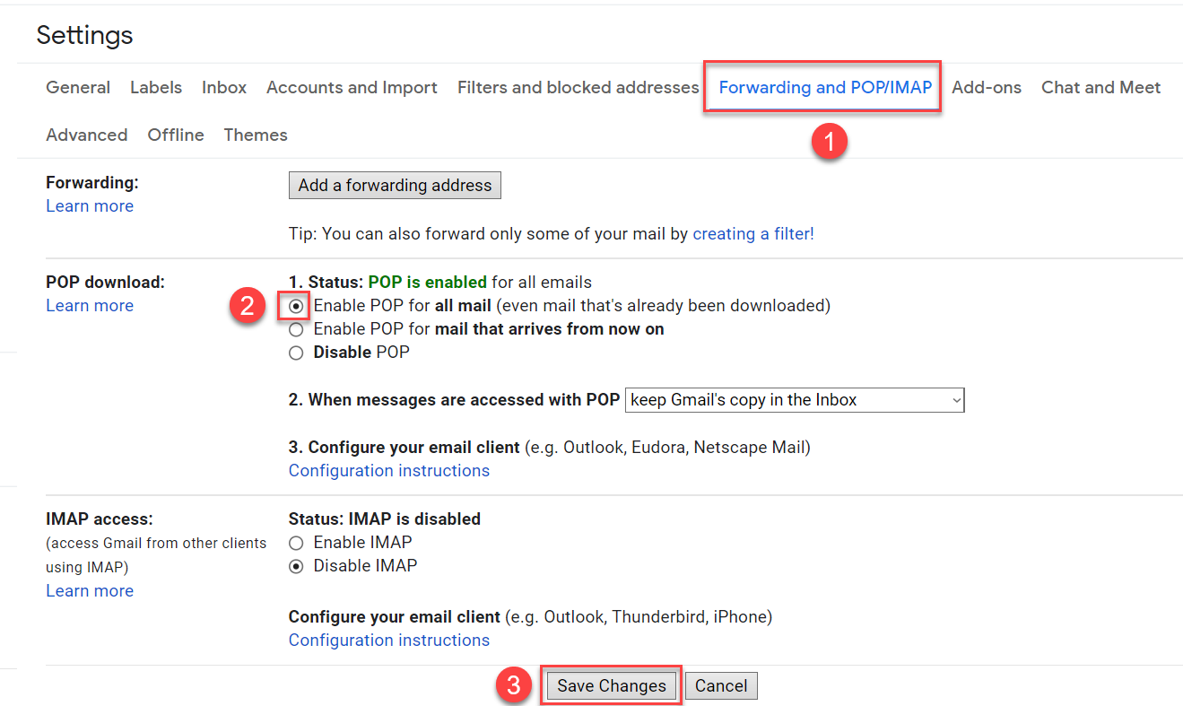 2. Click the Forwarding and POP/IMAP tab on the settings screen and under POP Download click Enable POP for all mail and click Save Changes.