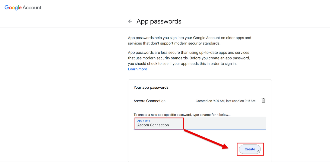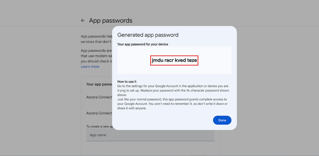 6. Copy the 16-character password shown. You will use this instead of your usual password for the email address login. This password will be required to complete the setup of your SMTP within Ascora.