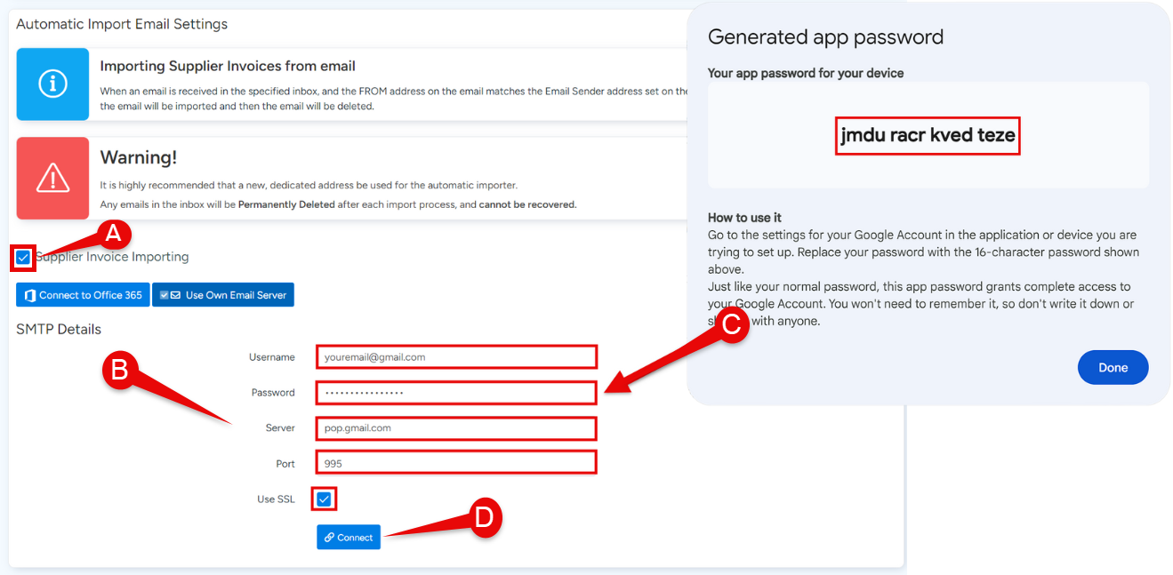 C. Ensure you use the App Password generated earlierādo not use your Gmail account password here.