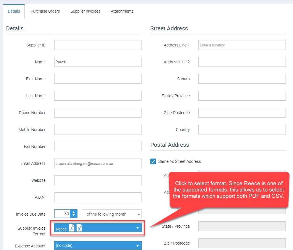 3.Ā The Supplierās Details Screen will display.Ā Ā Scroll down to the Supplier Invoice Format option and select the applicable format from the list.