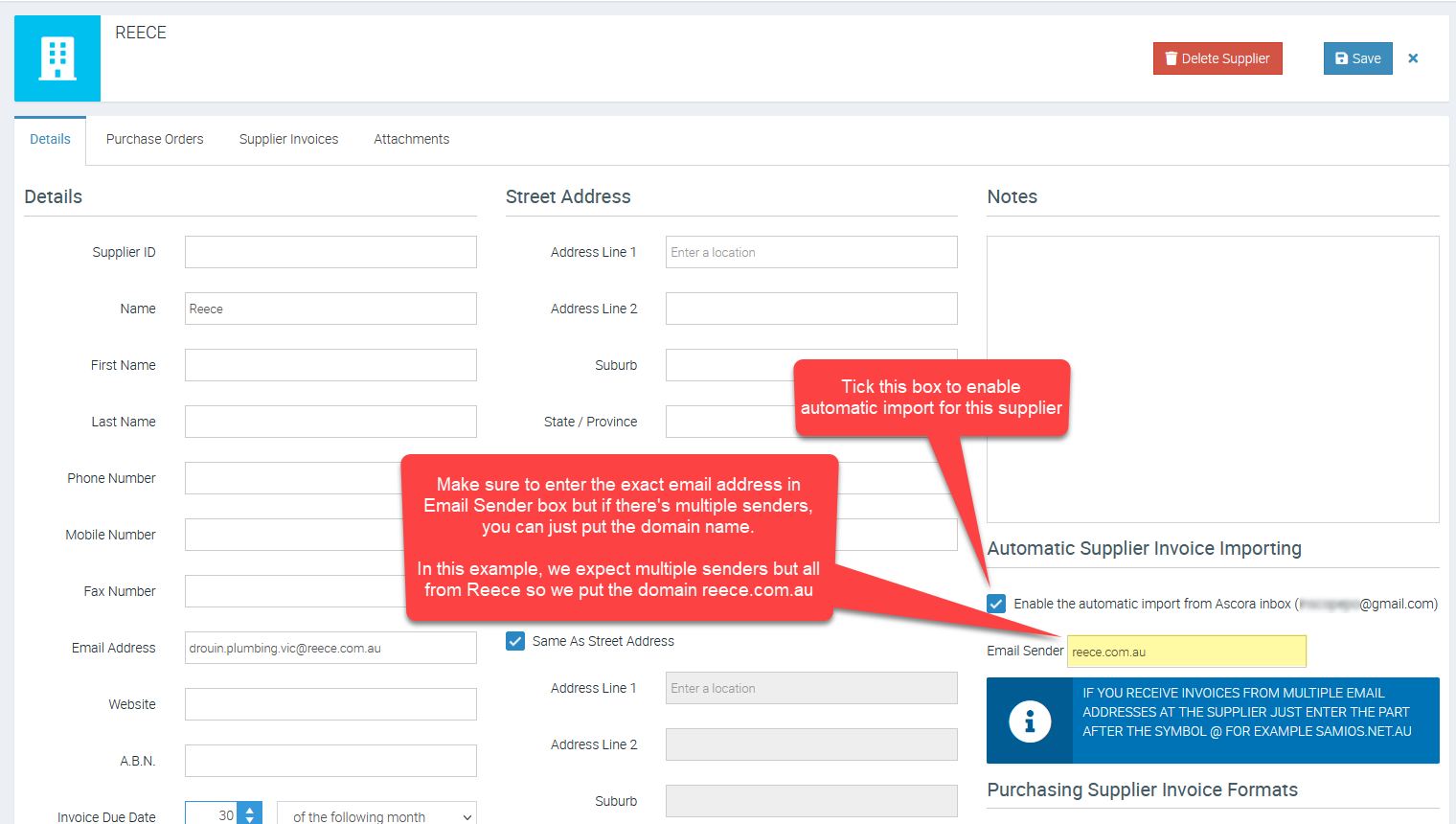 4.Ā Under the Automatic Supplier Invoice Importing section in the Supplier screen, tick the checkbox beside Enable the automatic import from Ascora inbox.Ā The inbox you configured in Step 2 will be displayed in brackets and the Email Sender textbox will appear.Ā Enter the email address used by the Supplier to send your Invoices in the Email Sender textbox. Ascora is now configured to automatically import and process Supplier Invoices for the particular Supplier.Ā Repeat these steps for any other Suppliers for which you wish to enable Automatic Supplier Invoice Importing.