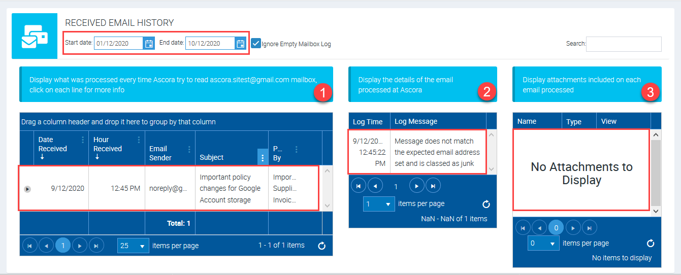 1 -displays the Date and Hour Received, Email Sender, Subject Line, and Processed By.