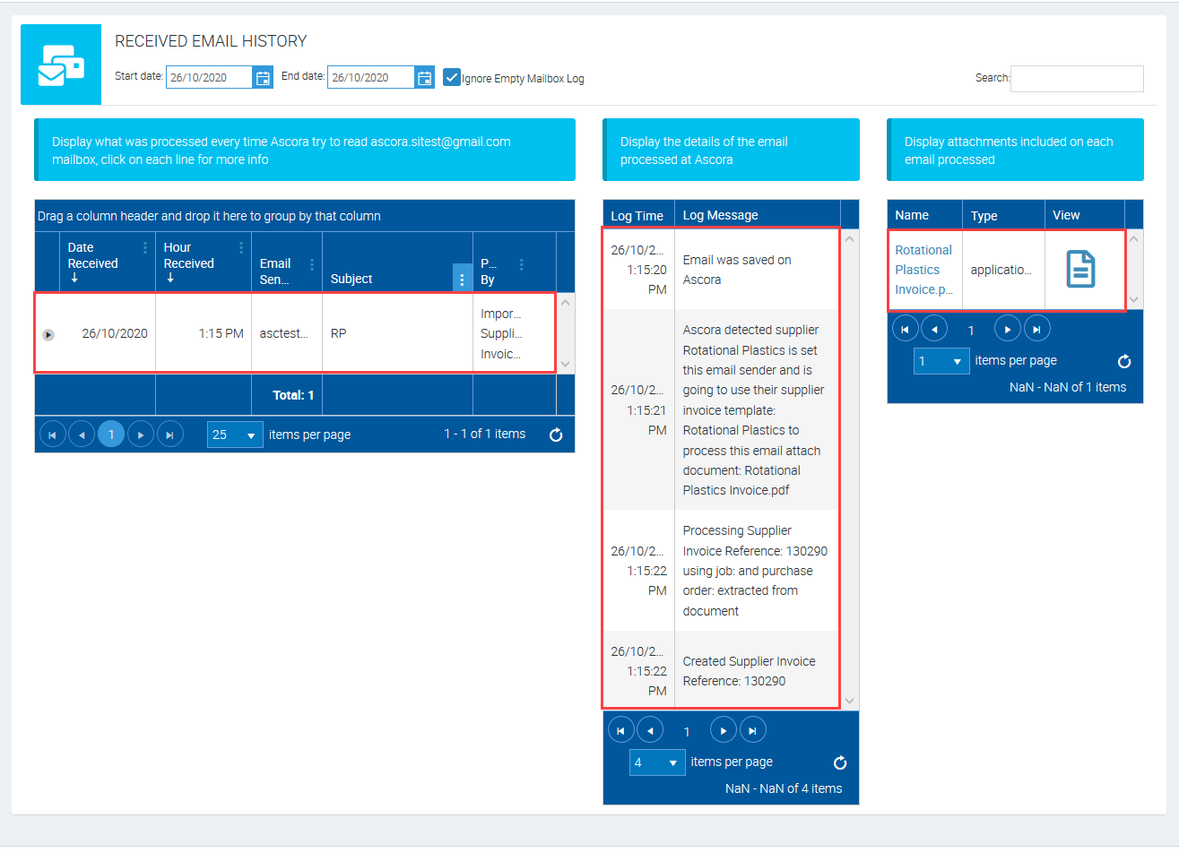 When you are using automatic supplier invoice import, there's an area where you can see the details or logs every time Ascora tries to import the emails. This is helpful to see whether imports were successful or not and you can also see logs indicating the outcome of the import or the error message why it failed.