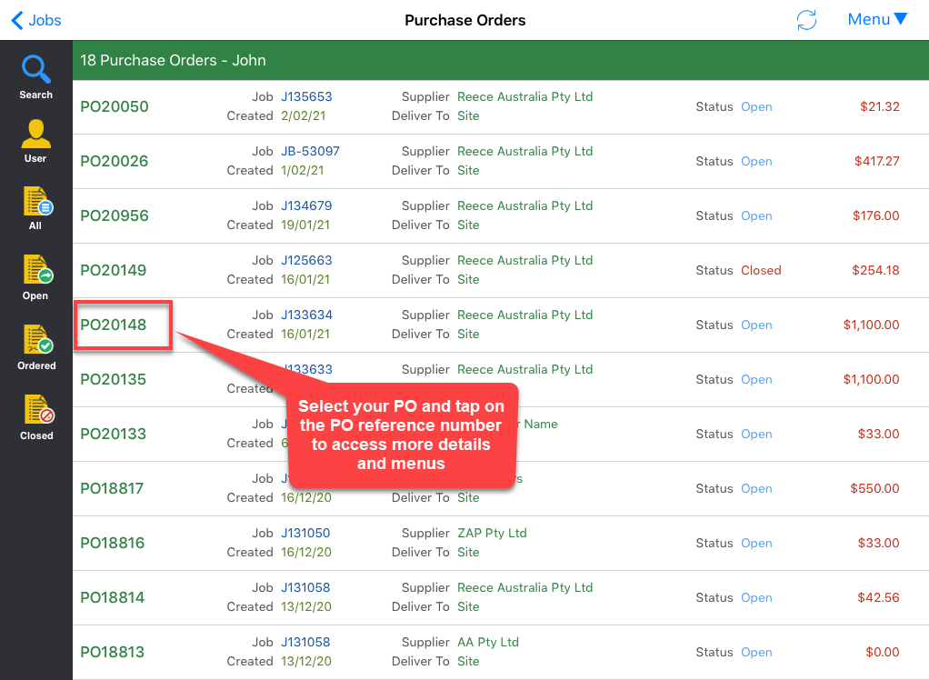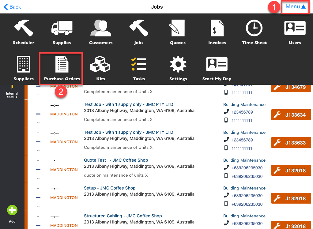 1. Tap Menu and select Purchase Orders.