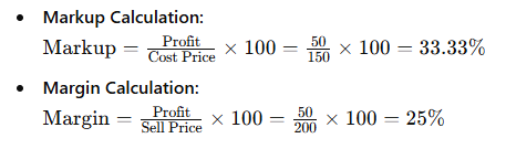 Although margin and markup are based on the same financial figures (cost, profit, and sell price), markup is always higher than margin because they calculate percentages differently.