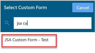 3. Search and select the custom form that you need to test and in this example, it's called JSA Custom Form - Test.