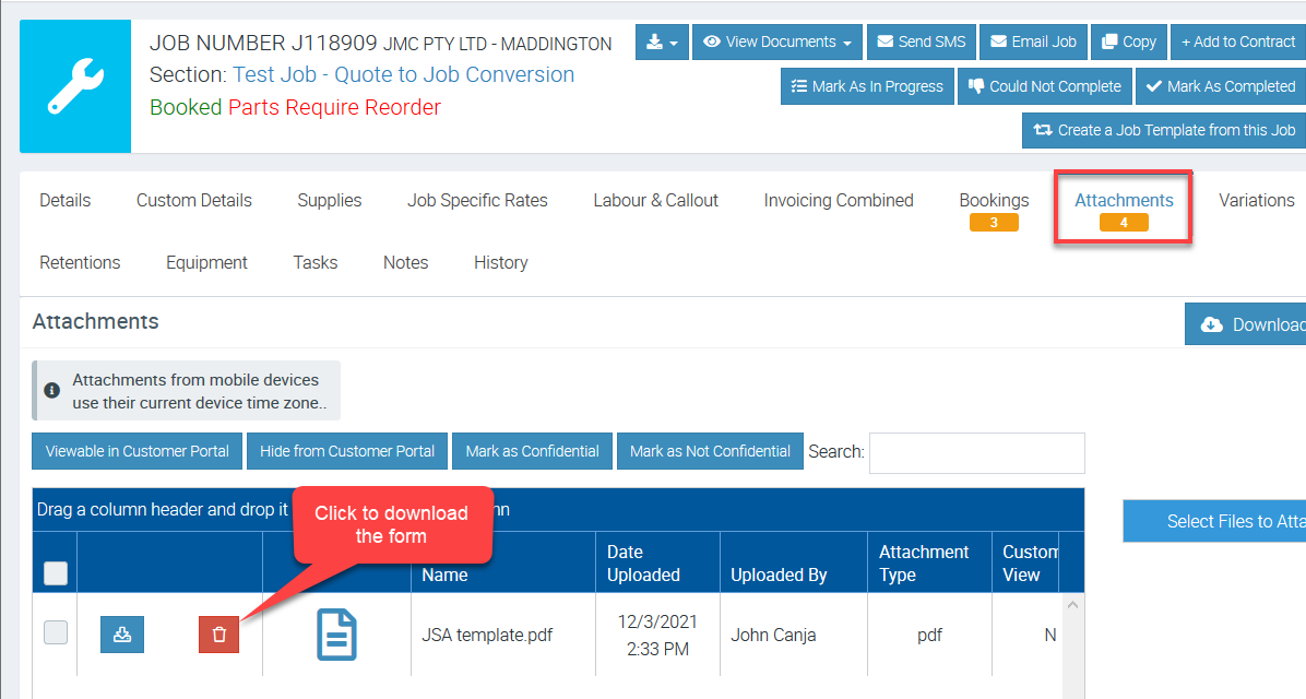 1. Access your job from the mobile app or use the search icon to locate a specific job where you want your custom form to be linked.