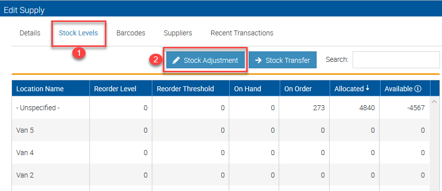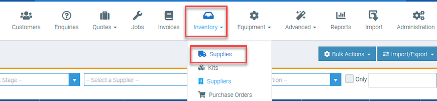 1. To adjust stock levels, go to Inventory → Supplies.