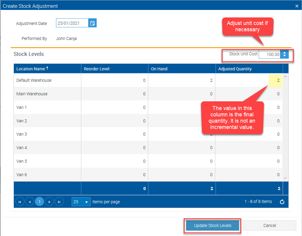 Adjusting Stock Levels