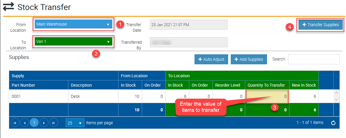 2. Select the source location and the target location, enter the quantity of the supply item that you need to transfer and click Transfer Supplies.