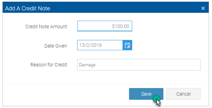 5. The Add A Credit Note pop-up window will display. Enter the Credit Note Amount, select a date from the Calendar and provide a Reason for the Credit Note. When you are ready, click the Save button.