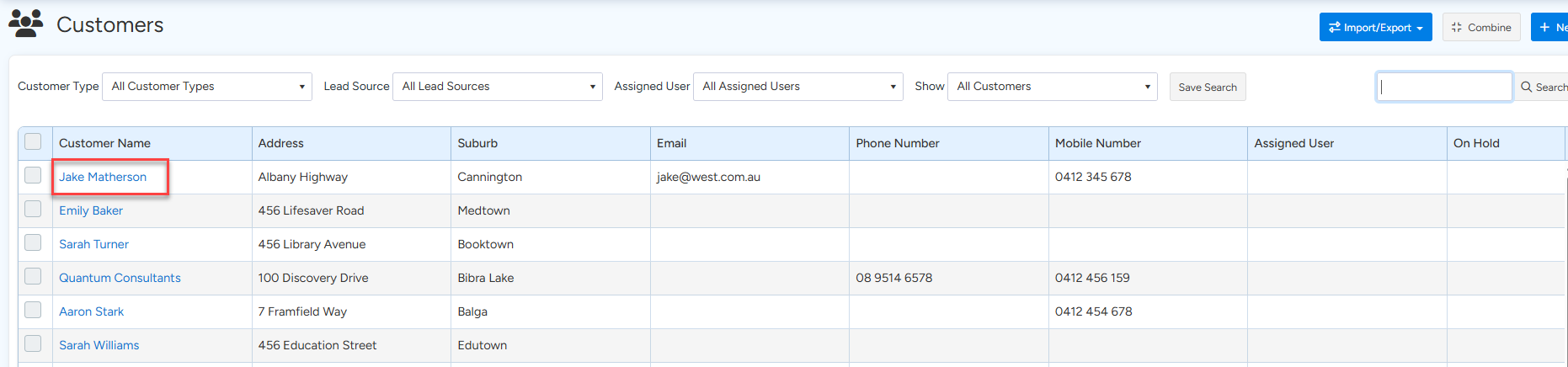 2. The Customer List will display. Locate the applicable Customer record and click on the customer.