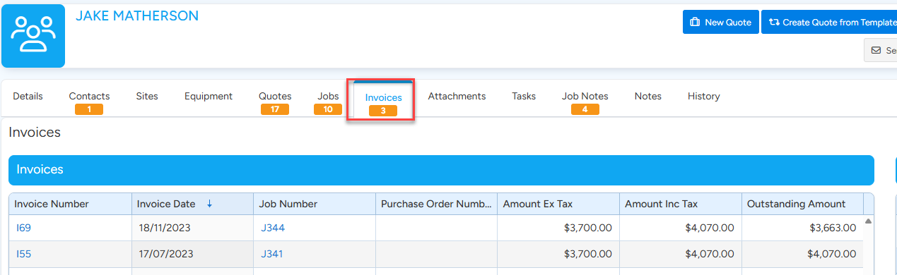 3. On the Customer Details screen, choose the Invoices Tab.