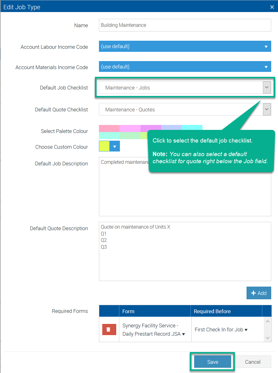 In this example, we are setting up a default checklist for job type called Building Maintenance.