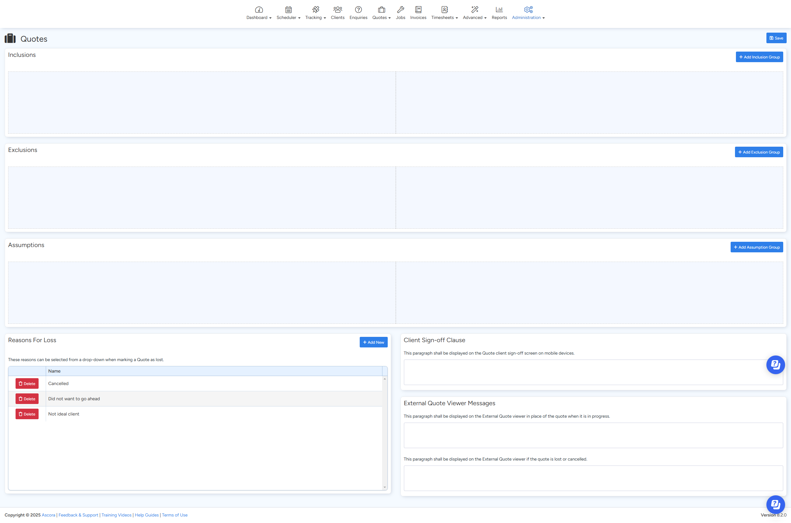 The Quotes Administration section in Ascora allows you to configure various settings related to your quoting process. This includes setting up inclusions, exclusions, assumptions, loss reasons, client sign-off clauses, and external quote messages. These settings help standardize quotes, improve clarity, and enhance client communication.