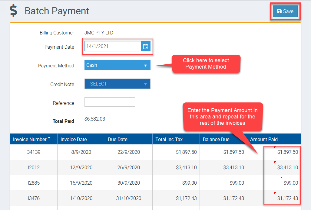 3. Enter the Payment Date then select the Payment Method. Go through the list of invoices and enter the Amount Paid for each of them or the ones that are part of the batch payment you are processing.