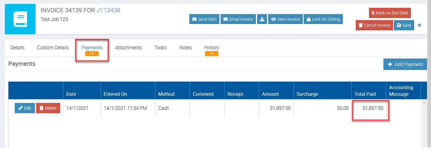 In this example, we opened Invoice 34139 with amount paid $1,897.50 showing in Payments tab. This is the amount we included when we processed the batch payment.