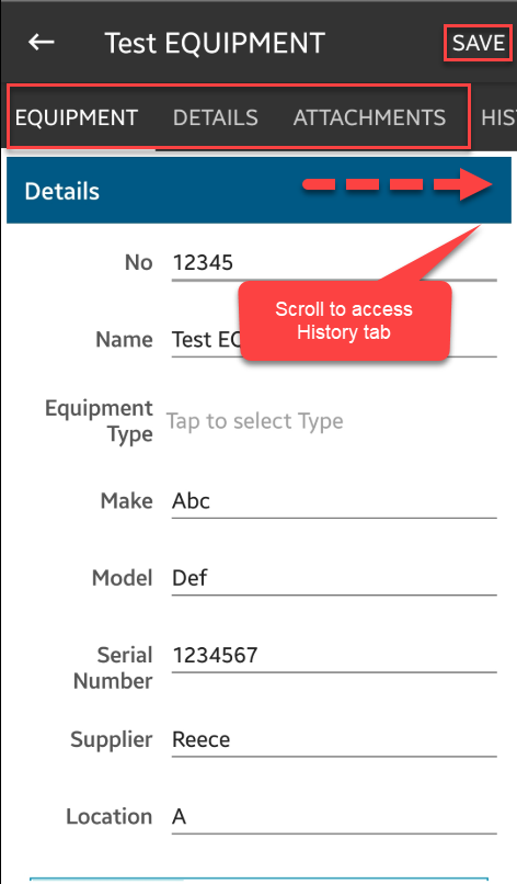 2. You can access the Equipment and Details screen, as well as Attachments and History.