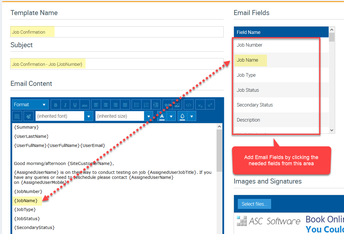 You can add Email Fields to auto populate certain information such as Job Name, Job Number, etc. In this example, we've added a few Email Fields and one of them is Job Name.