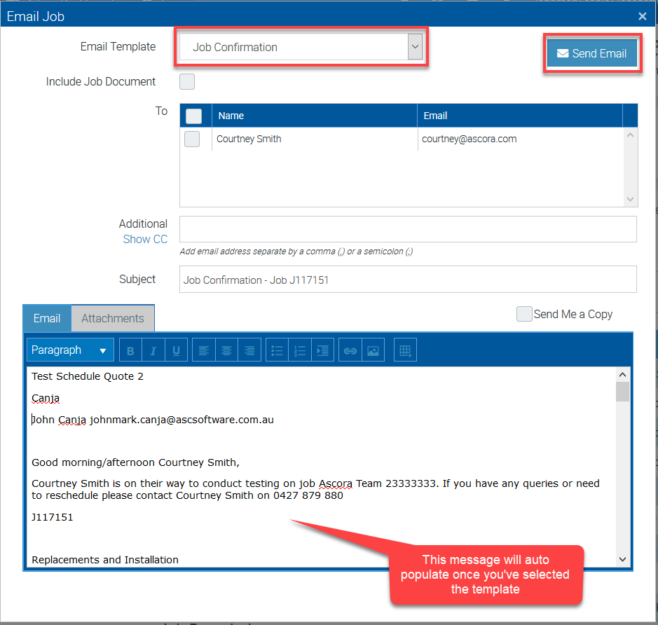 6. Select the template (in this example Job Confirmation) and the message should auto populate based on the template selected.
