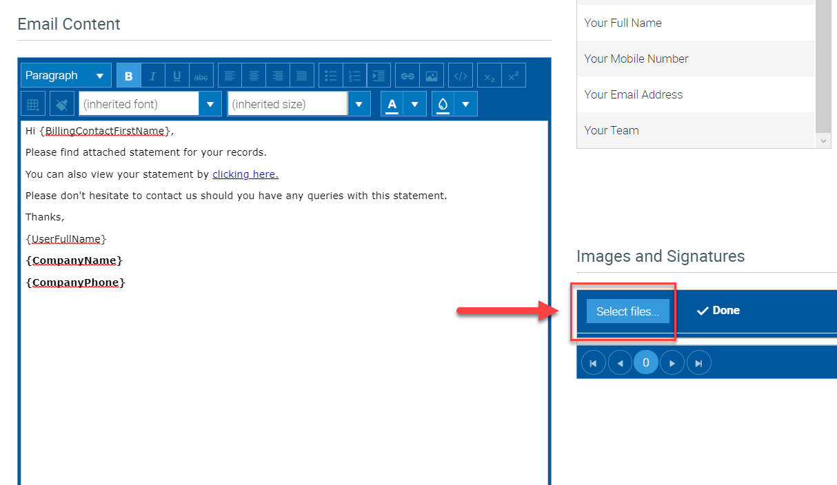 1. While in the Email Template screen, click Select Files located under Images and Signatures.