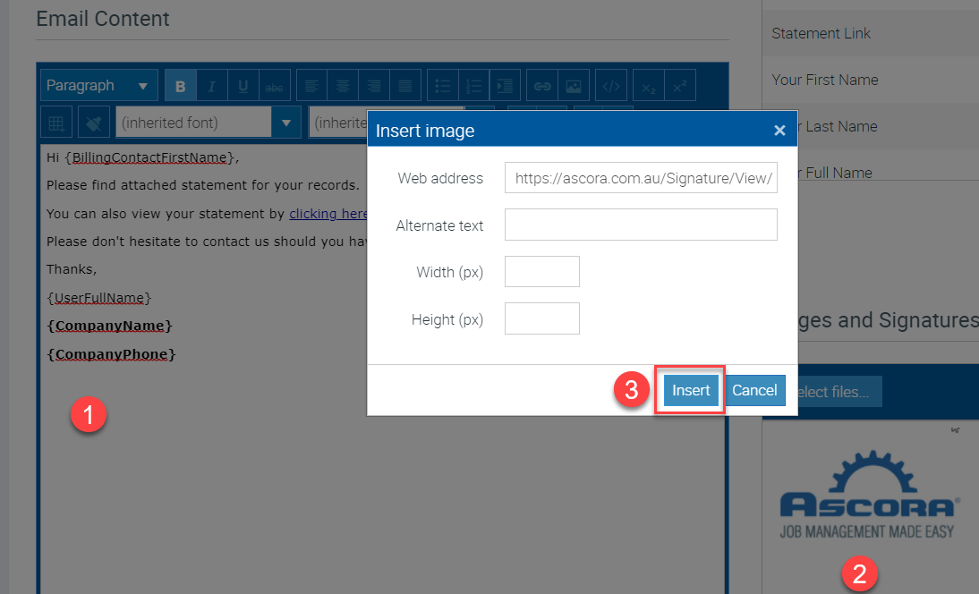 4. To insert the image in the Email Template, click the area where you want to place the image (in this example, right below the company name) and click on the image you want to add then click Insert box.