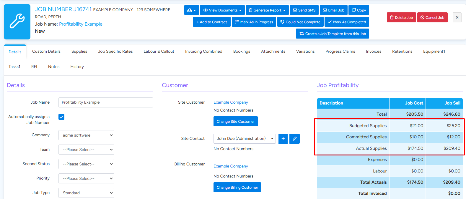 The Job Profitability breakdown is displayed in the main Details tab of a Job. Supply costs and sell amounts are distributed into three categories: Budget, Committed and Actual. The below image shows the Job Profitability for an example Job which will be used to demonstrate how the values are derived.
