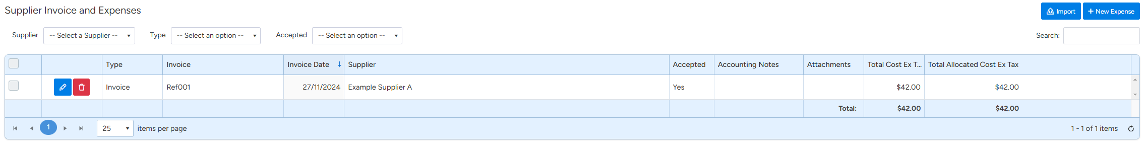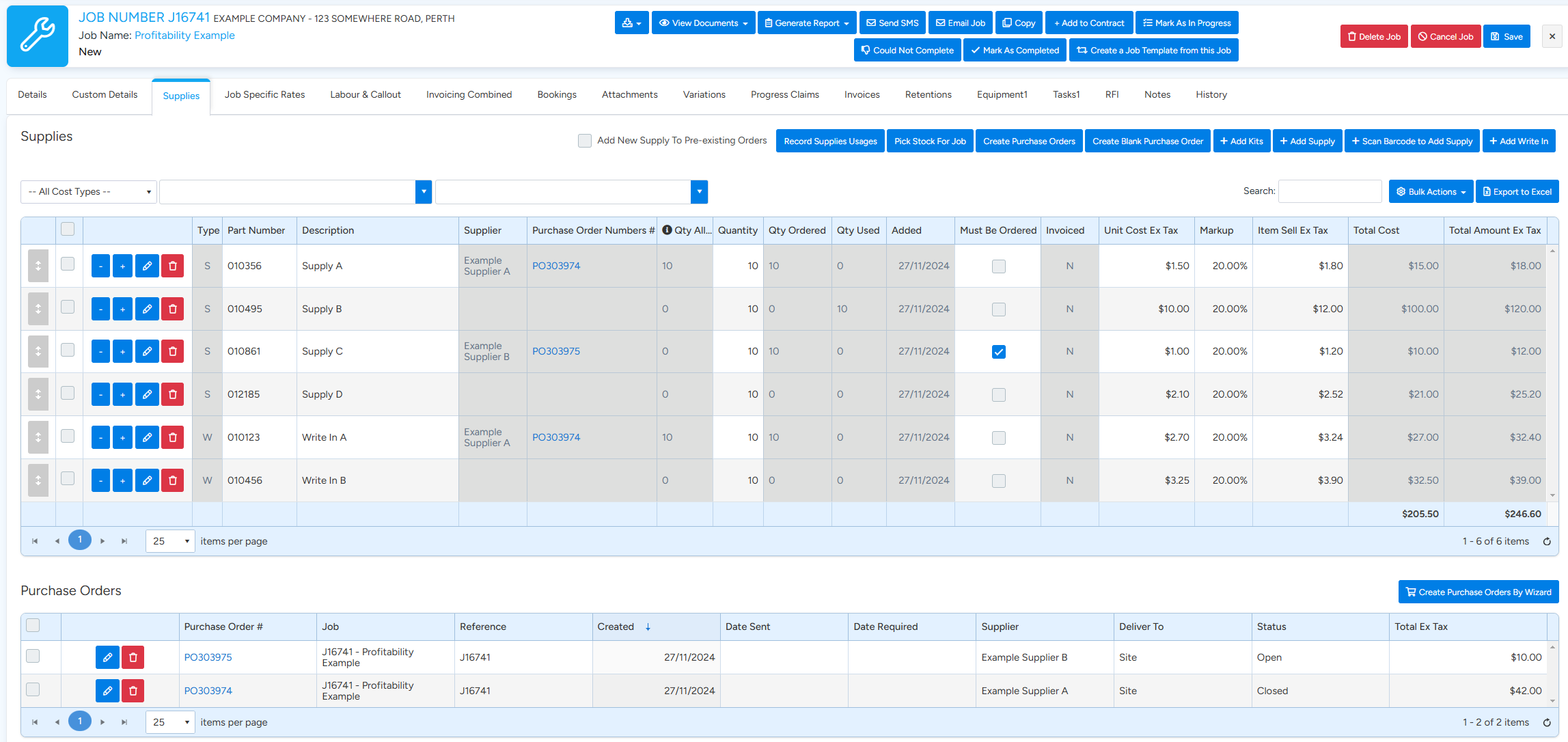The below images show the 6 supplies that make up the example job, as well as the Purchase Orders and Supplier Invoices.